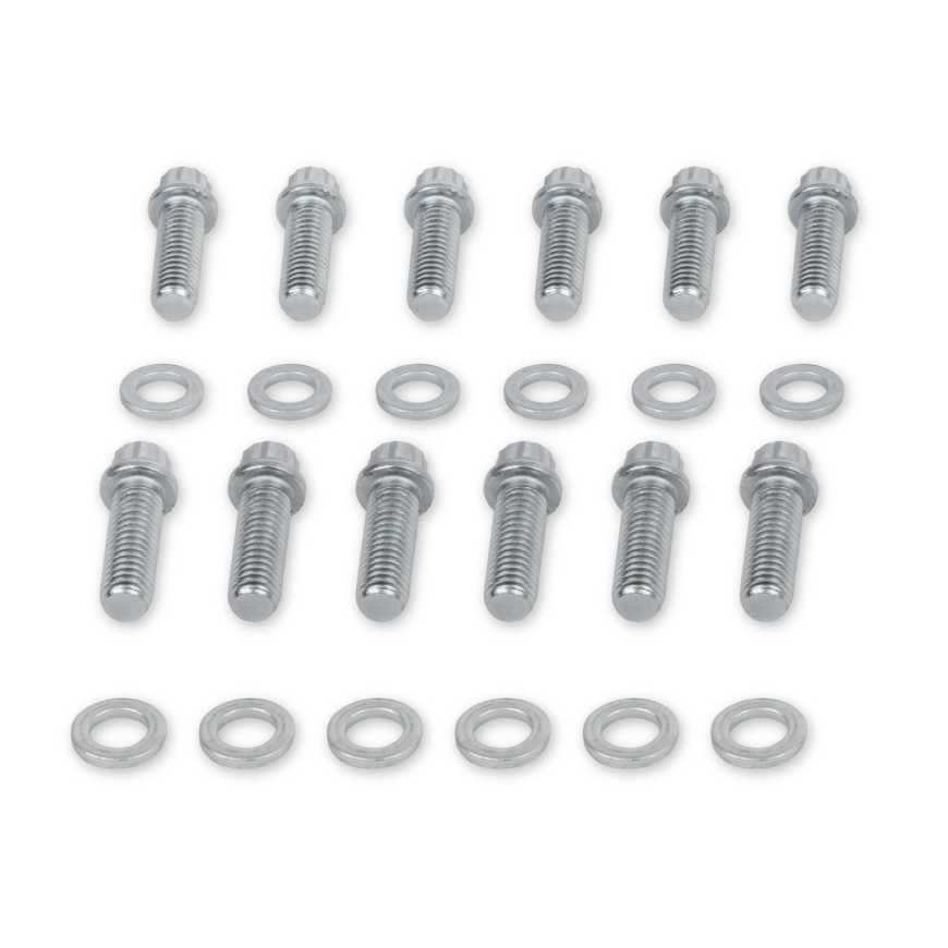 These special Grade 8 intake manifold bolts feature a 12-point smaller-than- standard head and flange, and include special extra thick flat washers for optimum clamping pressures. They're ideal for use where space is minimal, typical on larger runner race manifolds. These bolts and washers are bright zinc plated for protection and good looks.