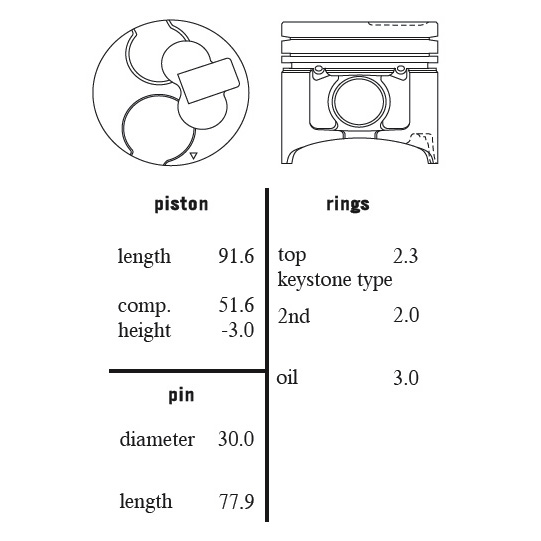 Piston set Mitsubishi 4M40T turbo alfin oil gallery 2.3mm (key) top 2.0mm sec 3.0mm oil pin 30.00 x 77.90mm bore 95.50mm (includes rings) 654 CH 51.60(-1.0)L=91.60mm