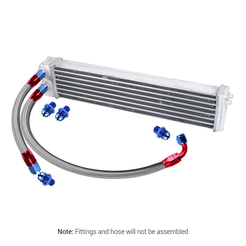 Mazda RX rotary high flow oil cooler kit includes MHOC-RX x 1 STAE0209-10-90 x 1 STAE0209-10-STR x 3 STAAN816-10-M16C x 3 STAAN816-10-M18C x 1 E633880MH x 3 (assembly required) Polished cooler, Blue & red fittings & stainless hoses