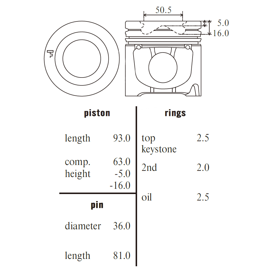 Piston set Mitsubishi 4P10 alfin with oil gallery, MOS2 skirt coated 2.5mm (key) top 2.0mm sec 2.5mm oil pin 36.00 x 81.00mm bore 95.80mm (includes rings) 000 CH=63.00(-5, -16) L=93.00mm