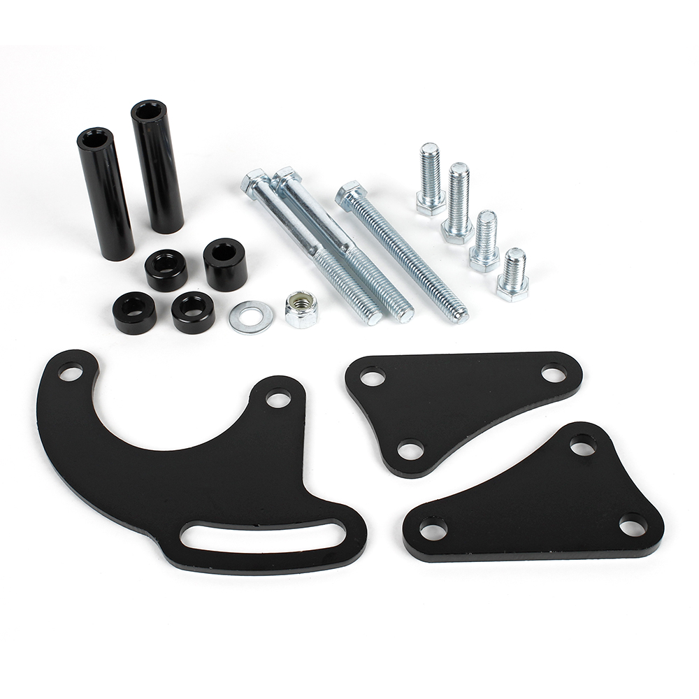 Power steering pump bracket kit BB Chev V8 with long water pump & factory GM saginaw powersteering unit, bolts to waterpump & block on left hand side, edp black steel finish M&H