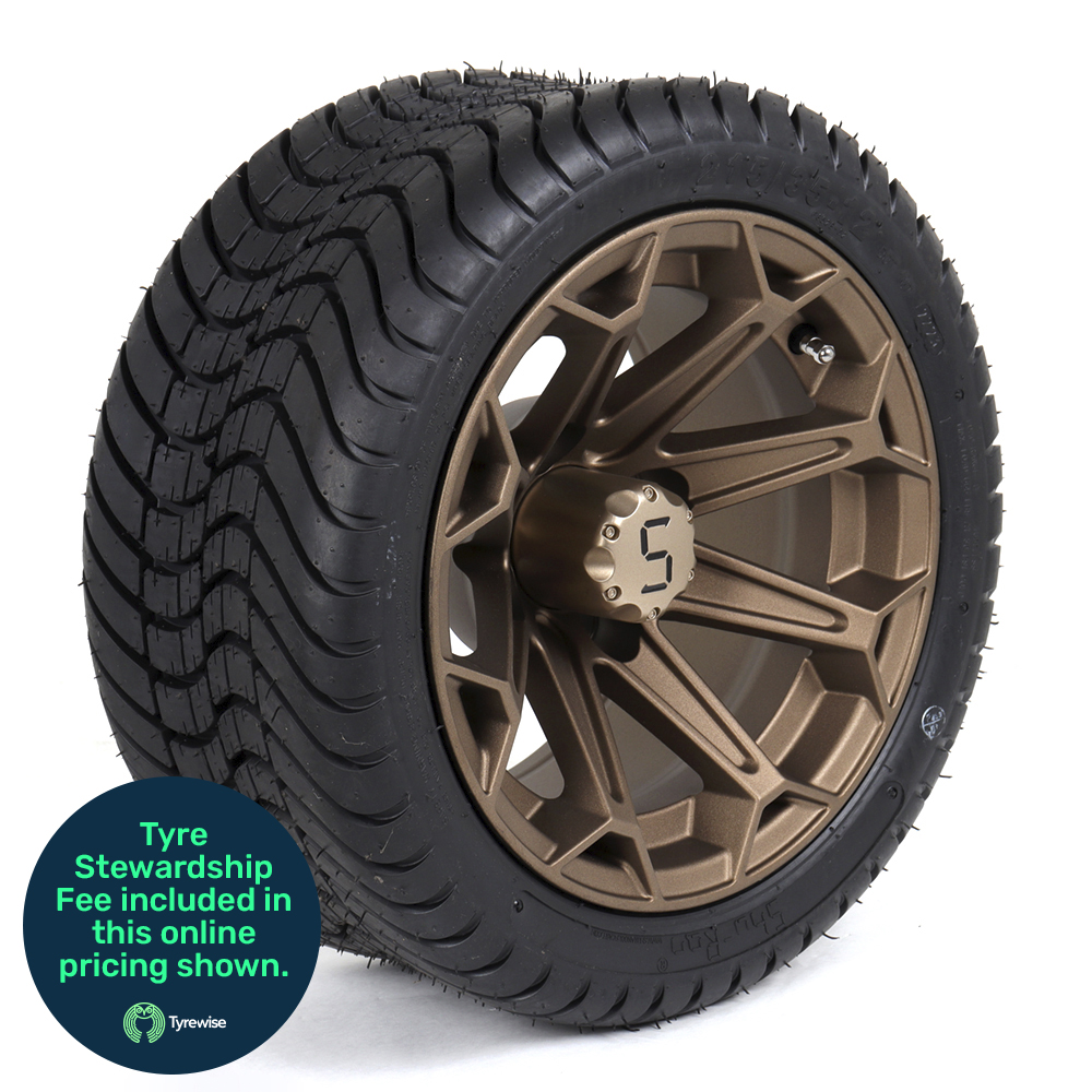 Rims 12"x 7 ET-25 offset 4x multi spoke Bronze finish pcd 4 on 4" / 4 on 101.6mm, includes fitted to rims 215/35-12 tyres & 1/2" thread wheel nuts (set of 4) Golf Cart Ezgo, Yamaha, Club Car, E-Z-Go