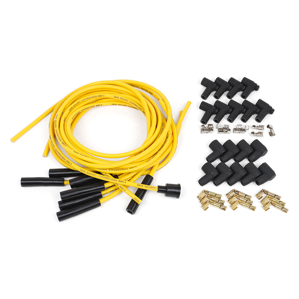 Ignition wire kit straight spark plug ends Yellow 8.5mm universal cut to length leads, 90 deg female & male HEI distributor boots & terminals supplied separately in the pack requires crimping to suit your app, 2x 29" 2x 36"2x49" 2x 54" 1x coil 17" appro