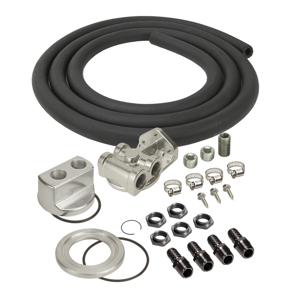Oil filter relocation kit includes 10ft x hose and 3/4-16 13/16-16 M18 x 1.5 M20 x 1.5 M22 x 1.5 thread adapters 15780