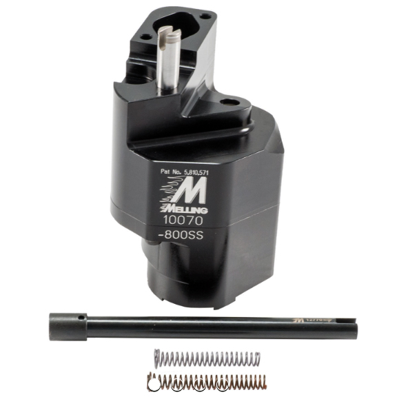 Oil pump Chev BB high volume oil pump for street & strip applications with 8” deep pans 25% more volume over stock pump, Integrated screen, Lightweight billet 6061-T6 alloy Includes moly shaft, stud kit and +10# and -10# relief springs Melling 10070-800SS