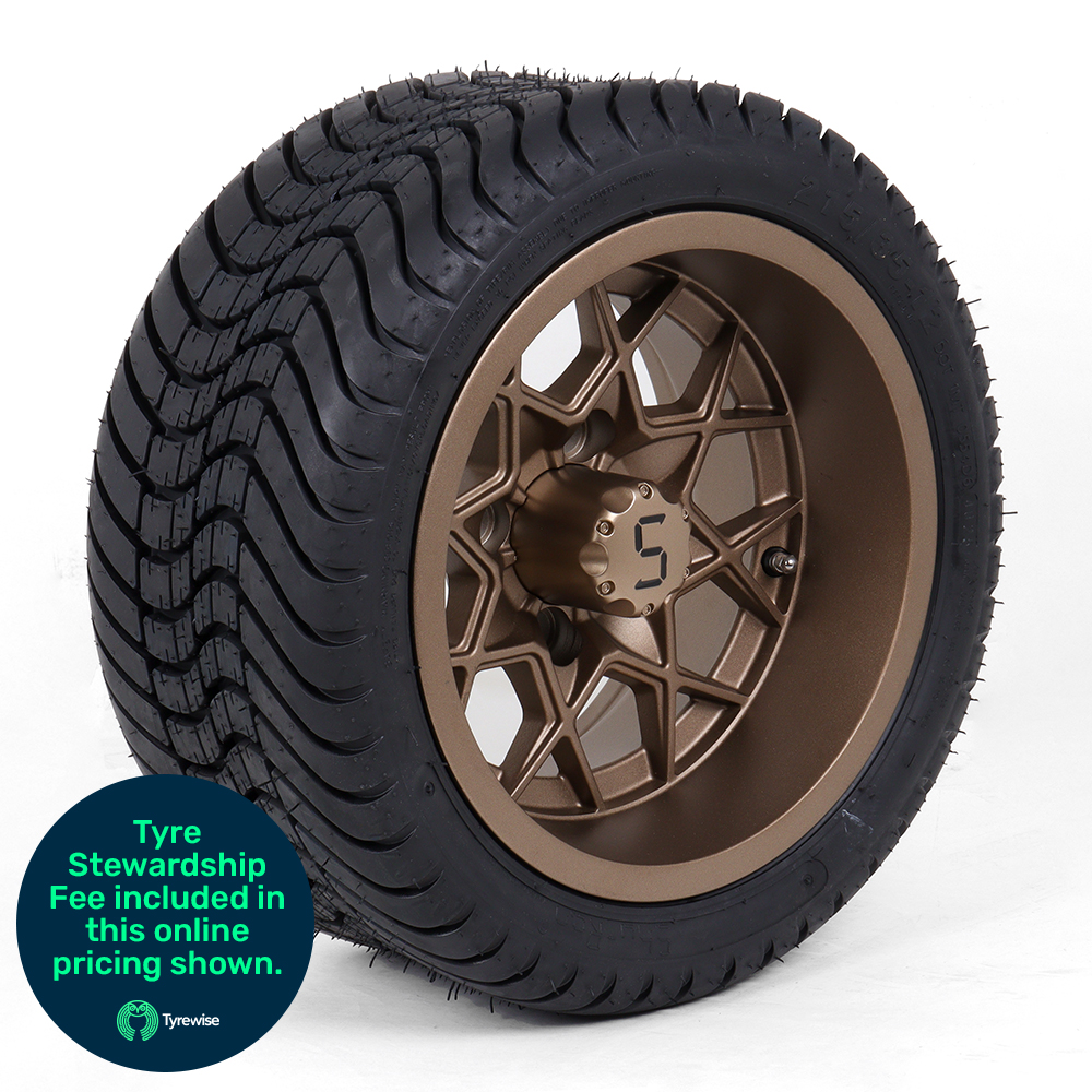 Rims 12"x 7 ET-25 offset 4x 8 spoke Bronze finish pcd 4 on 4" / 4 on 101.6mm, includes fitted to rims 215/35-12 tyres & 1/2" thread wheel nuts (set of 4) Golf Cart Ezgo, Yamaha, Club Car, E-Z-Go