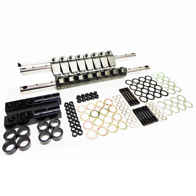PRW Pro Series Billet Aluminum Shaft Rocker Arm System , including steel pedestal stand, 8 pairs of shaft-mount rockers with adjustable cup-style valve lash adjusters, shims, and other related Fasteners, Studs & Bolts and hardware.