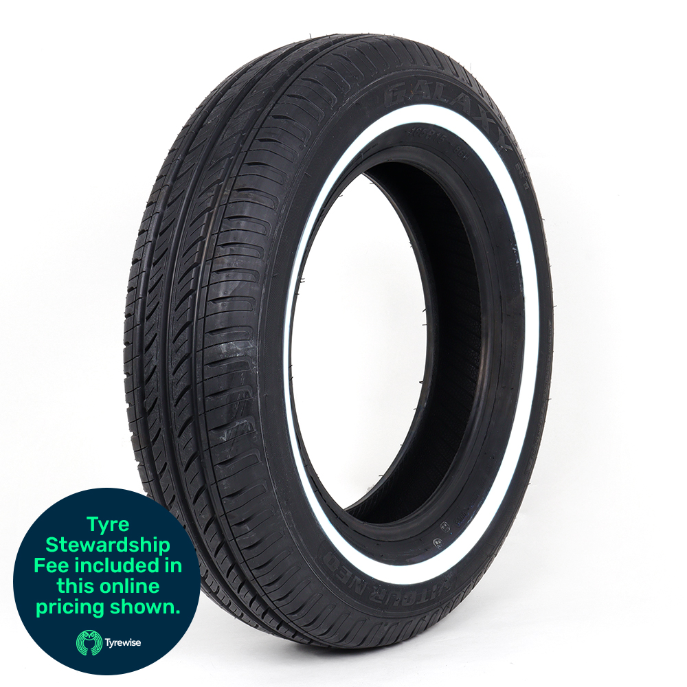 Tyre 15" 165R15 Vitour Galaxy R1 86H white side wall 19mm 3/4" oldschool VW. Tyre dia 640mm. Width 165mm.Max 530kg load rating 44psi 7.8mm tread depth. for 4" - 6" max rim widths