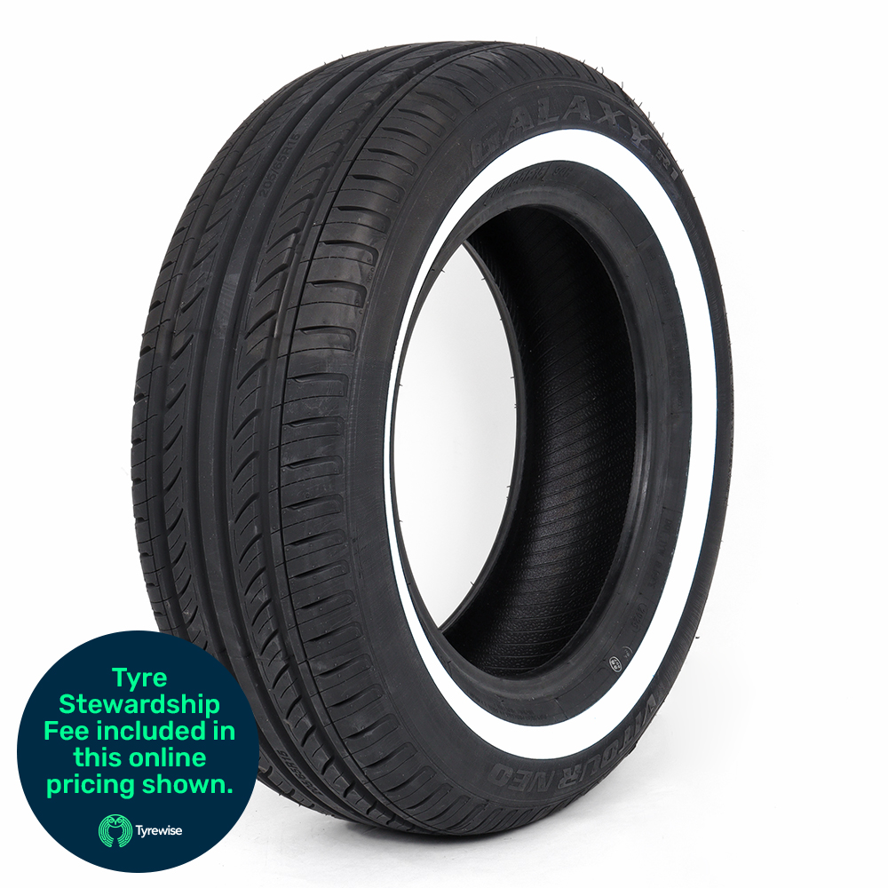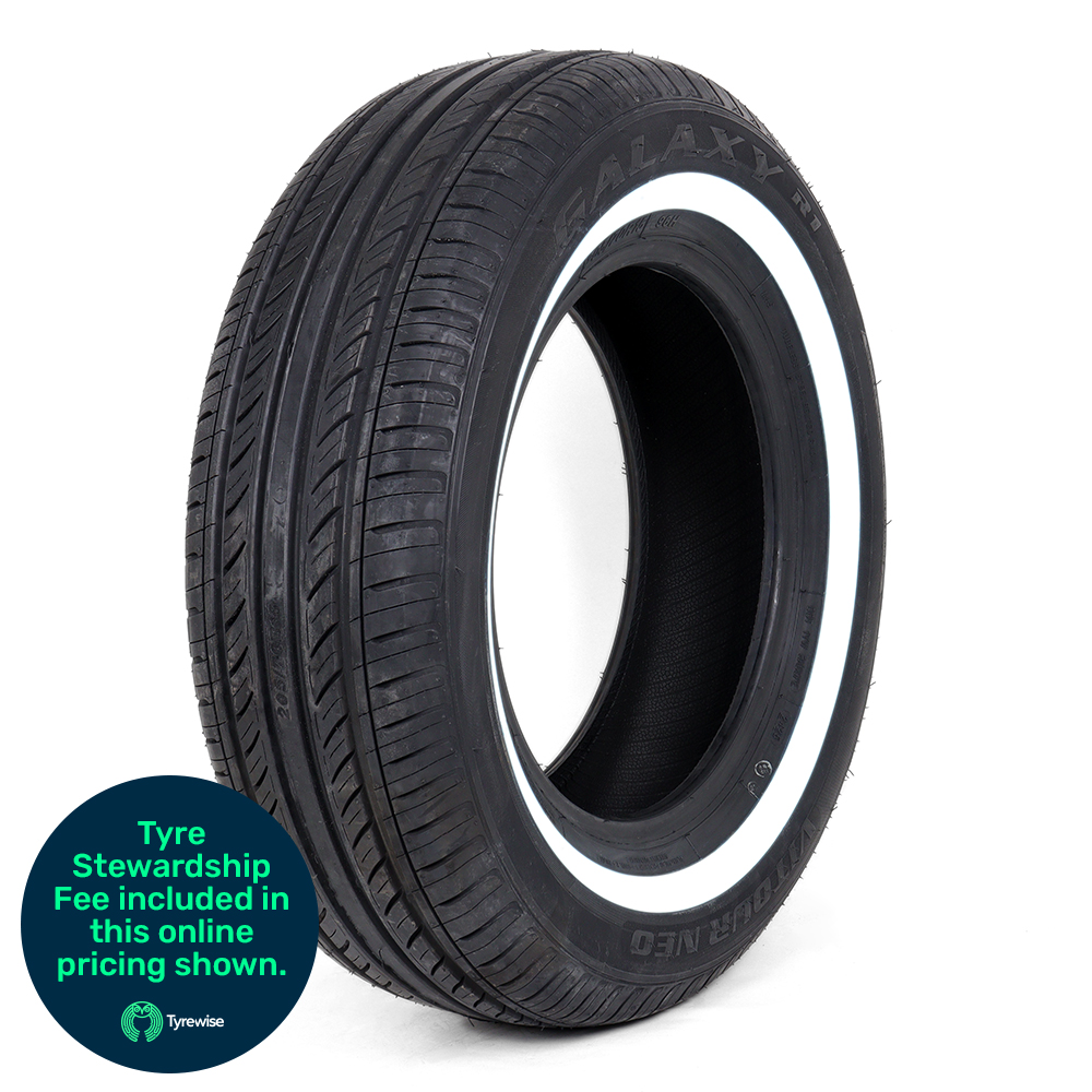 Tyre 15" 205/65R15 Vitour Galaxy R1 94H WSW TL White side wall 1 1/8" 26mm. Tyre dia 647mm. Width 209mm.Max 670kg load rating 44psi 7.8mm tread depth. for 5.5" - 7.5" max rim widths