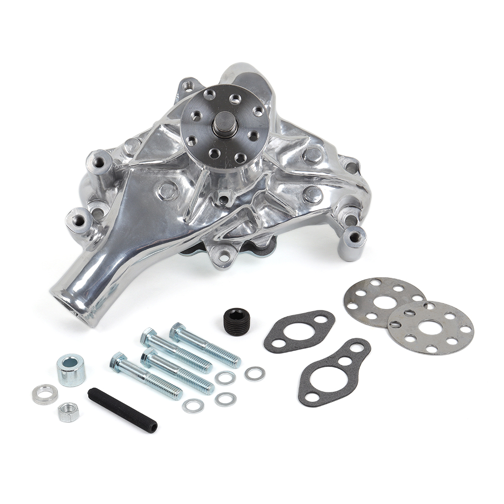 This long-style water pump from M&H fits Chevy 305 & 350 small block V8s (1969–87), featuring a 175mm depth from flange to base. It includes a threaded third hole for power steering mounting, heavy-duty bearings and seals, and an 8-blade cast alloy anti-cavitation impeller for reliable cooling. Finished in polished aluminum for added style and corrosion resistance.