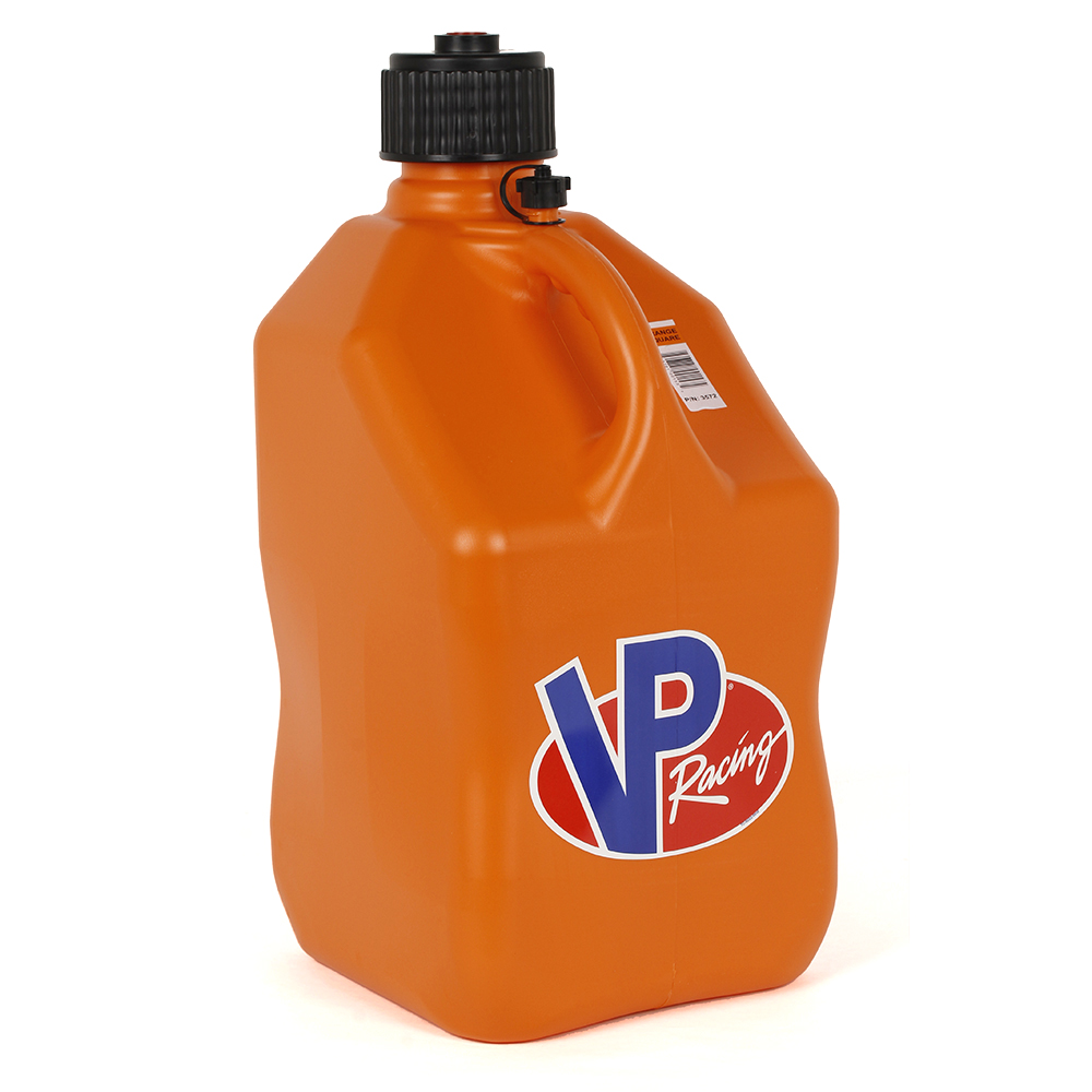 VP Racing Fuel jug container 5 gallon 18.9 litre Orange high-density polyethylene construction D.O.T. approved 22L x 9.5W x 22H inch square